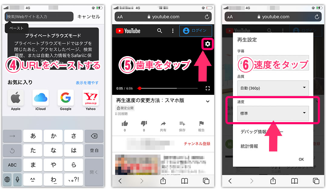 コピーしたURLをブラウザにペースト→歯車タップ→速度を選択します。